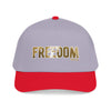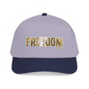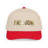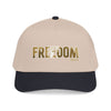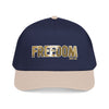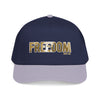 A structured mid-profile baseball cap that channels a rugged, Americana energy. The front features bold FREEDOM lettering with a textured, slightly worn look that reads like a well-traveled patch. The two-tone design—muted charcoal crown with a darker brim—keeps the look grounded and versatile. Wear it on morning drives, road trips, or backyard gatherings; it settles easily into everyday rotation and carries a quiet, determined vibe rather than shouting for attention. The seamless front panel keeps the embroidery or print crisp, while the matching undervisor and sweatband add a pulled-together finish. This cap sits comfortably and adjusts with a durable snap closure so it feels broken-in from the first wear.